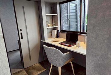 低めの天井に大きな窓。狭いけれど開放感を感じされる心地よい集中の小空間