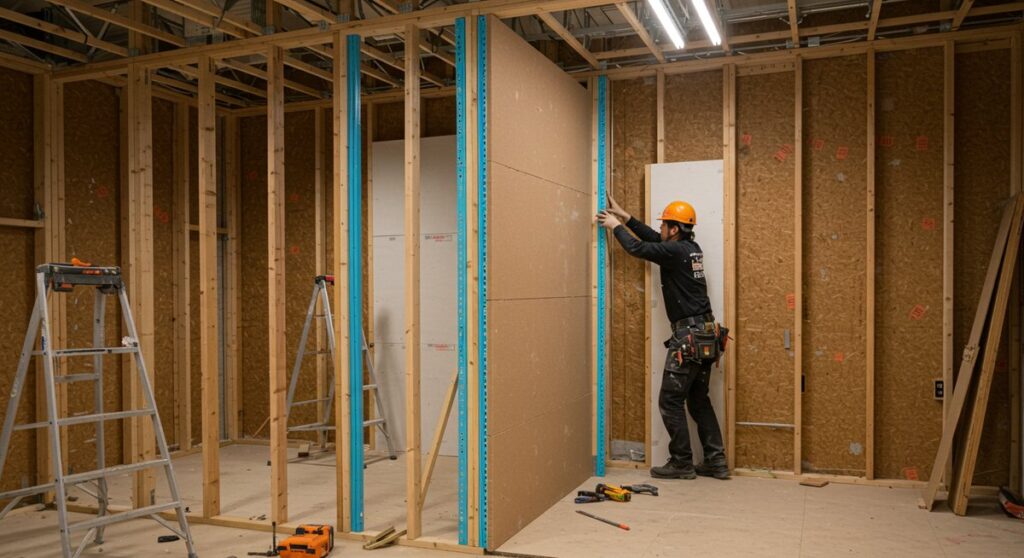二重壁は壁を二重にして内部に空気層や吸音材を入れる構造で、比較的高い遮音効果が得られます。音の透過経路を増やして減衰させるため、楽器室やホームシアター向けに向いています。
