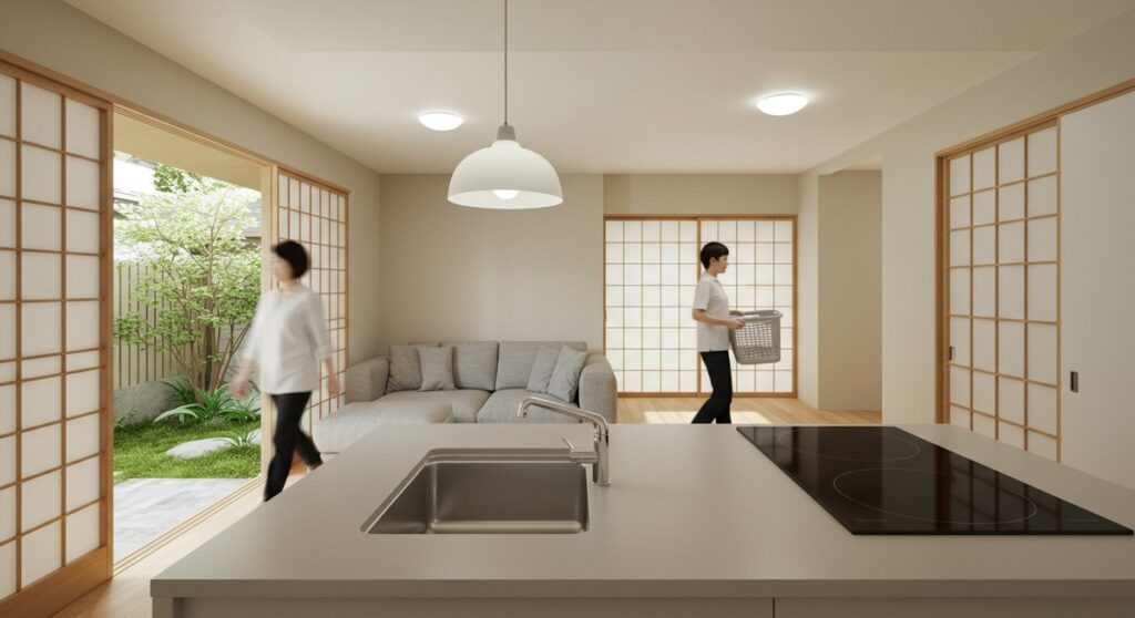 キッチンから洗濯機、物干し場、収納までの動線を短くすると家事の時間が短縮されます。行き来する距離が短いだけで、掃除や片付けの回数が減り、日常の疲労も軽減します。