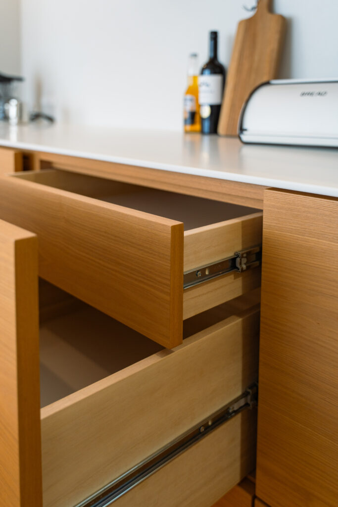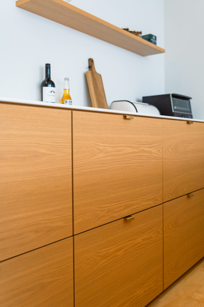 木の扉と白い天板で統一し、ゴールドの取っ手が上品なアクセントに。