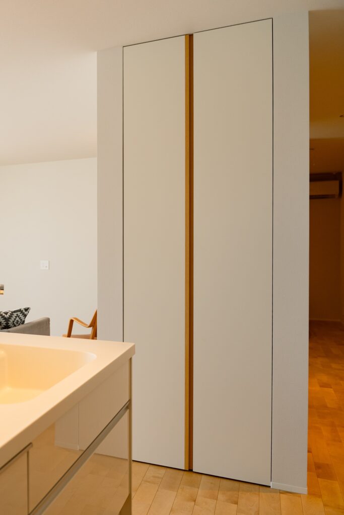 白い開き戸の中央に木のラインをあしらい、造作家具とデザインを統一。