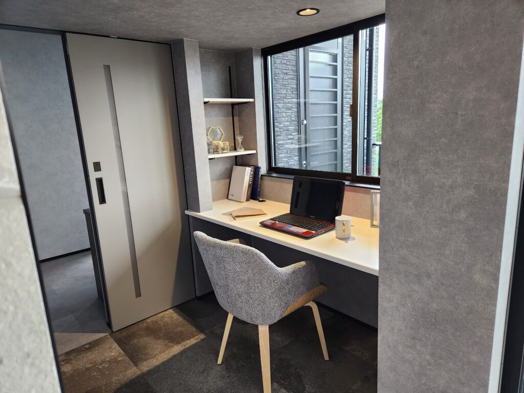 低めの天井に大きな窓。狭いけれど解放感を感じられる心地よい集中の小空間。