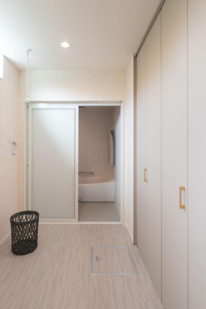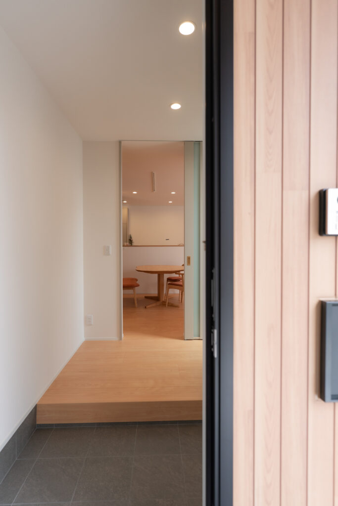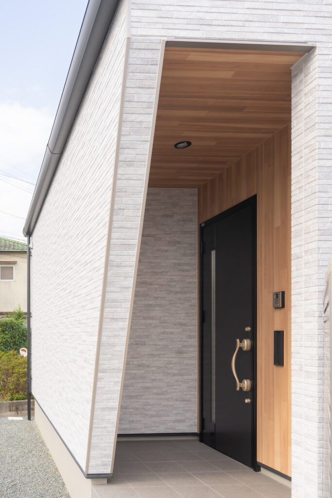 外から玄関が直接見えない、落ち着きのあるアプローチ空間です。