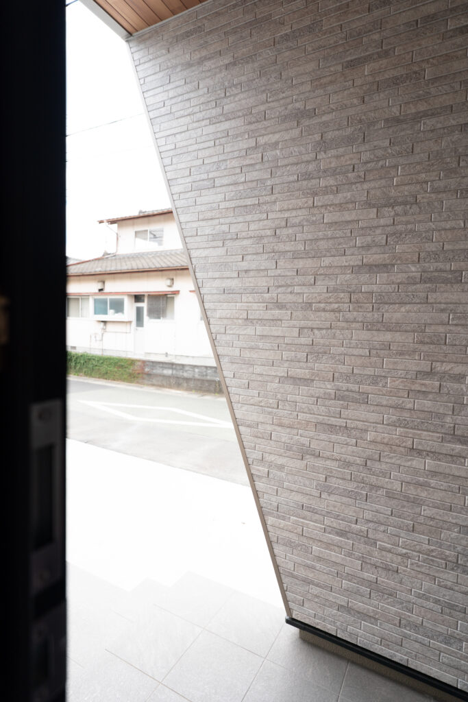道路側からの視線をやわらげる目隠し壁を設け、玄関まわりのプライバシーを確保。