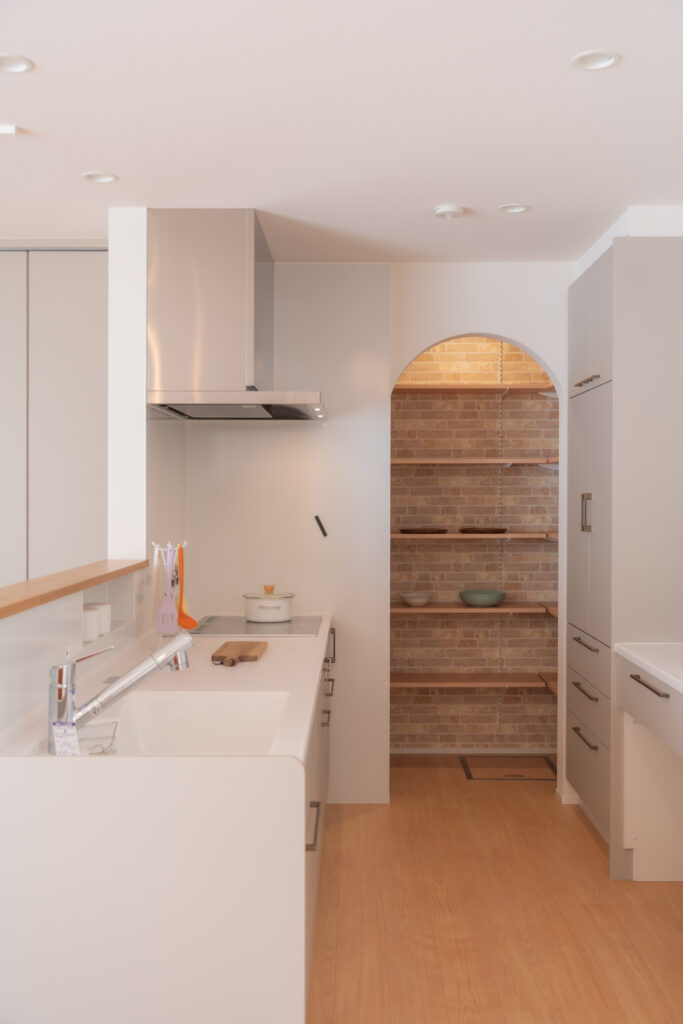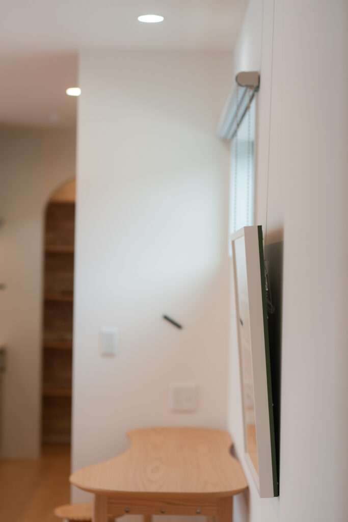 アーチ型の下がり壁が、機能性とやわらかなデザイン性を添えています。